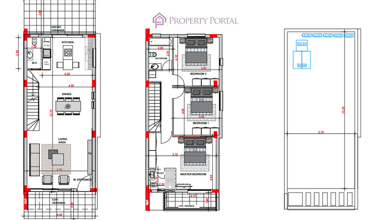 Modern Semi-detached house for sale in the Agia Marinouda area, Paphos. It features three spacious bedrooms, one of which has a private en-suite bathroom, a guest toilet, and a shared bathroom.